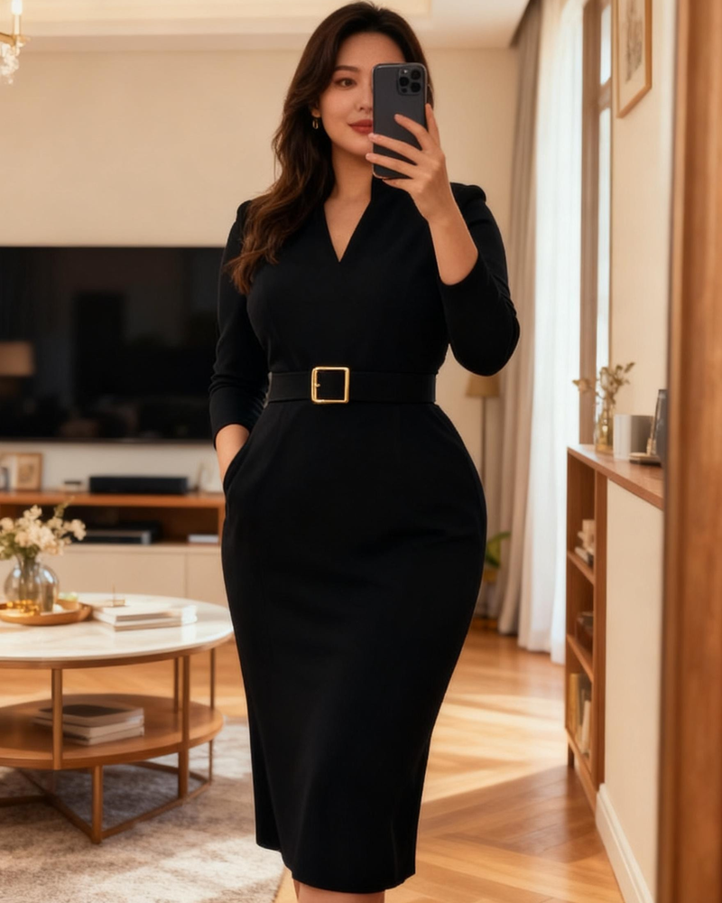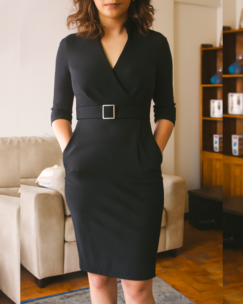 Refined Black Belted Sheath Dress with Mandarin Collar